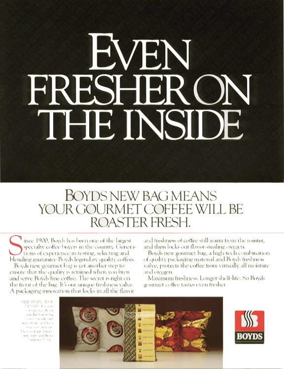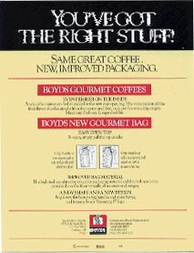 coffee. Management wanted to I worked with management to create the communications tools that provided for a smooth transition. I came up with a theme, "new on the outside, even fresher on the inside," and a slogan, "you've got the right stuff.” The slogan was simple, easy to understand, and played on the recently popular movie, "The Right Stuff." As most of our accounts were restaurants, we needed to make sure that the message reached everyone from business owners to accounts payable clerks to waitresses. The materials I produced included a flyer that was put into every case of coffee, a mailer sent to all coffee customers, a statement stuffer, copy for an "on-hold" message, newsletter articles to prepare our sales force in the field, and copy for our customer service representatives. As preventive damage control, I met with the customer service department to prepare the reps for possible customer concerns and appropriate responses. White was the dominant color of our old packaging. Yellow was the primary color of our new packaging with expensive-to-produce gold-on-black trim. Frankly, it was an unattractive yellow ochre shade, but the marketing manager responsible for the design had read that yellow is the most recognized color in advertising. In spite of that, I decided that the message would be communicated most effectively by having our educational materials aesthetically match the packaging. A couple of the materials I created are shown here. Depending on your monitor, you may not be able to see the gold lettering in the background of the flyer. The outside of the flyer says, "new on the outside.” When you open it up, you see, “even fresher on the inside." The back page was mostly white with our logo, return address, and space for a mailing label.